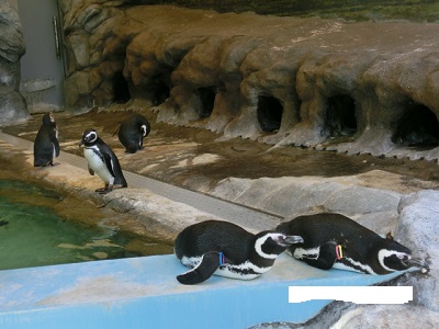 「ペンギンランド」にいるのは、南米原産のマゼランペンギンだ。南極にいる種に比べれば、飼育や施設の維持もだいぶ楽なのだろうと思われる。 背後には巣穴も6つ再現されていて、人目を忍んで2羽でそこに こもっているペアもいた。 それ以外の奴らは基本、「他人には我関せず」という感じで、近くに立っていても別々の方向を向いている。それでも時々、3羽ぐらいで鳩首会談ならぬ「ペンギン首会談」をする姿も。 |
