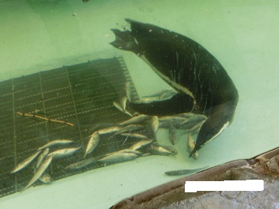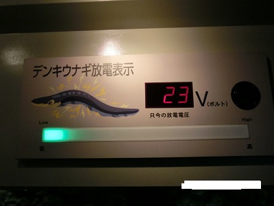 | デンキウナギの水槽の上部には、放電中の電圧を知らせる掲示板が。怒った時や、狩りをする時にだけ放電するのかと思いきや、常に微弱な電気を出しているようです。 電圧が強まると、緑色の表示が黄色、赤と変わるのだが、何をきっかけに(あるいは何に反応して)そうなるのかがわからない。ただ、電圧が上がるとビビビビビと大きな音が鳴る演出はうまいと思う(実際にウナギが出している音であるはずはないのだが)。 |