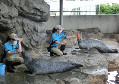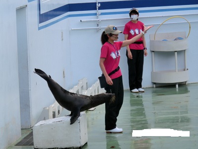 | ショーの最後は、イルカショーでは定番の「犬神家の一族」ポーズで、さようなら。園児たちがいる正面の客席だけではなく、横手のテラス席にも手(尾びれ)を振ってくれるのが素晴らしい。ちなみに正面席は、海水をかぶれる「特典」はあるものの、濡れたアクリルガラス越しの鑑賞になるので、写真を撮るならテラス席のほうが良いですね。 新型コロナ禍の影響で、ご覧のとおりトレーナーさんもマスク姿だし、イルカ、アシカ、アザラシの各ショーは、いずれも7分間ほどに短縮されていた。それでも開館すらできなかった一時の状況に比べれば、ずいぶんと正常化したか。 |