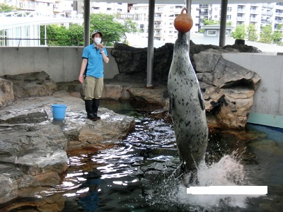 「アザラシ館」でも約7分間のショーが。これは2頭のゴマフアザラシが、それぞれラッパとハーモニカを鼻息で(笑)吹いているところですね。 実は午前と午後のショーを両方見たのだが、左側の老婆ゴマちゃん、午前の部ではやる気が出なかった(飼育員さん談)らしく、プールから上がってこなかった。おかげで右側の子がラッパとハーモニカを順番に吹くハメに。 |