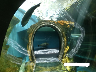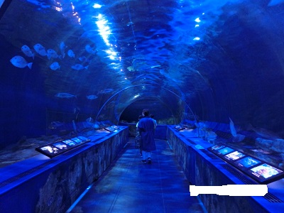 | これは「アザラシ館」とは別のトンネル水槽。水量500トンの大水槽をくぐる、22メートルの散歩道ですね。 「約60種900尾の魚たちが優雅に泳ぐ」という謳い文句ながら、一番目立つのはウミガメだったか。 「いきものトーク」の時間には、説明役の飼育員とは別に、水槽内にダイバーのお姉さんが入り、エサやりなどします。 |