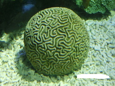 サンゴ礁の世界を再現した「海の宝石箱」の片隅に転がる球形のサンゴ。エルキュール・ポアロなら「私の灰色の脳細胞とそっくり」と言うかもしれませんね。 |