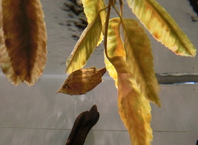 | 黄色っぽい葉っぱに擬態したリーフフィッシュ。そう、真ん中で左向きになっているやつです。 葉っぱを食べる動物が来たら、今度は黄色い葉っぱが魚のフリをします(ウソです)。 |