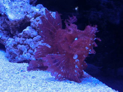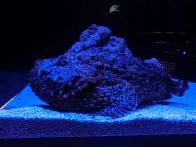 こちらはまるで岩石かサンゴのようなオニダルマオコゼ。中央上部のとがった部分(とぐろウ●チのようにみえるところ)は背後の岩なのだが、こうして写真に撮ってしまうと境目がほとんどわかりません。 |