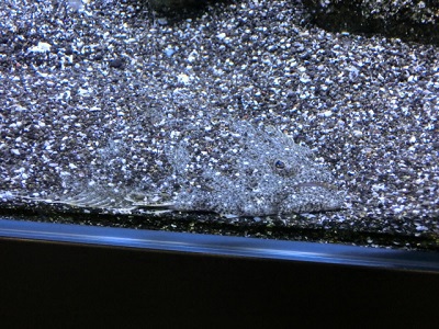 | うまく隠れたつもりでいるヒラメ。「その程度の技術で私の目をごまかせるはずがなかろう」と指摘してやったら、落ちこんでペシャンコになっていました。 |