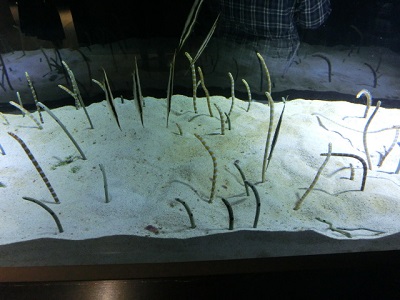 倒立して泳いでいるのはヘコアユ。他の水族館でもチンアナゴと同じ水槽で展示されている例を見たから、きっと生息地が同じなのだろう。 |