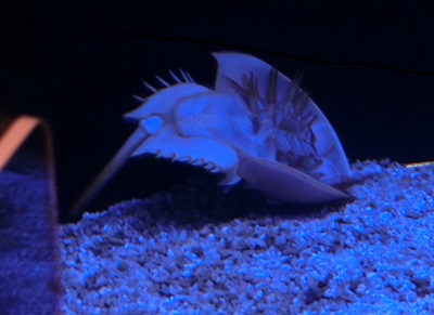何かの弾みで裏返しになってしまい、起きあがろうと一生懸命のカブトガニ。左の写真にマウスのポインターを当てると、もがいている様子がわかります。(追記:IE11だと写真が変わらないみたい。ITリテラシーが低いので、傾向と対策はよくわからず)