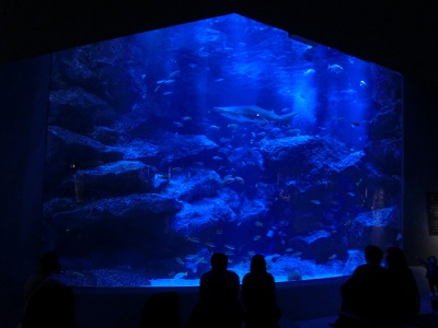 小規模な展示が多いすみだ水族館にあって一際デカいのが「東京大水槽」。正面は高さ6メートル幅9メートルだそうだが、奥行きもけっこうなサイズがある。それを側面から見たり、吹き抜けの上の階から見下ろしたり、下の階から見上げたりできる設計になっている。