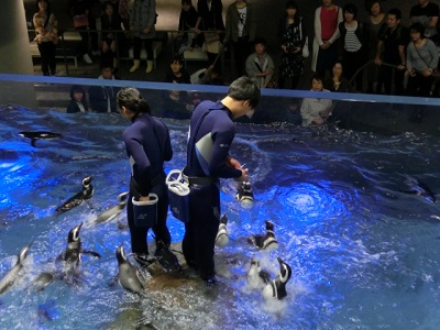 この2人がペンギンに魚を与えながら、個体を識別して「誰それ食べました」と報告。それを後ろにいる3人目のスタッフが記録する。そうやって数十羽いるペンギンのそれぞれが適切な量の食事をするよう管理しているらしい。適当に与えているんじゃないんですね。