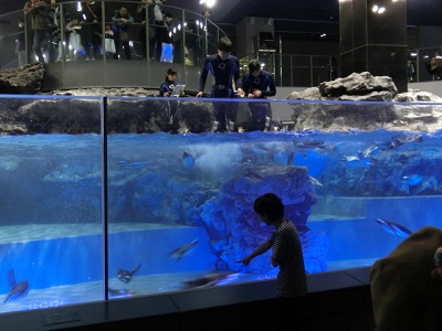 ショーのないこの水族館にあって、唯一呼び物になりそうなのがエサやりなのだが、すみだ水族館はこの点でも自然体だ。入り口でエサやりタイムを知らせるでもなく、館内アナウンスをするでもなく、プール内の掃除などをしていたスタッフがいつの間にかエサやりに移行している(下)。「気づいた人だけ見ていってね」という姿勢らしい。 |