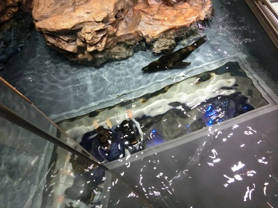 それだけではない。プールの底に人影が見えることにお気づきだろうか。トンネルをくぐって、泳ぐオットセイを下から見上げることもできるのだ。 |