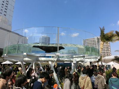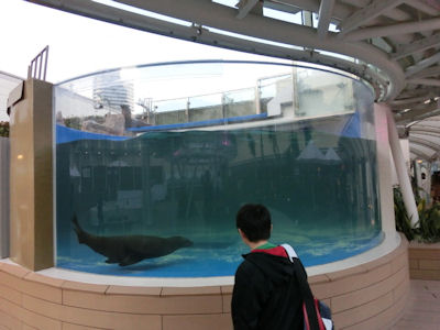 | エレベーターから屋上フロアに出ると、真っ先に目に飛びこんでくるのが、直径8メートルの「アクアリング」。リニューアルの目玉である。 アシカ君は(メスかもしれんが)ドーナツ状の透明なプールの中を、こうして下から見上げられ、ミュージアムショップの窓からは見下ろされ、文字どおり全方向の視線を集めつつ、飽かずグルグル回転運動。真下から見れば「青い空を羽ばたくように泳ぐ」(パンフより) 私が見ていた限りでは写真の向きに一方通行だったが、逆回りもするのだろうか? |