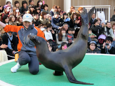 | アクアリングの下では、1日に数回、ショーもある。スペースの制約のためか、“芸人”さんのキャリアのためか、スペクタクルなジャンプなどは見られないが、それでも定番の倒立や輪投げなどを披露し、満場の拍手を集めていた。 そう、満場なんですよ。平日の午後だってのに。リニューアルオープン当初は入場制限までしたのだとか。世の中、暇な人が多いです。 背後の観客の視線があさっての方を向いているのは、隣にもう1頭、別のアシカが出ていたから。ステージは3つあったから、本当の繁忙期には3頭で出演するのかもしれない。 |
