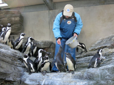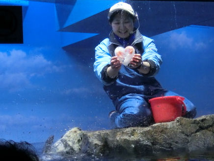 こちらは「ペンギンビーチ」。やはり1日数回、エサやりを兼ねたミニガイドが行われる。鶏卵より少し大きなペンギンの卵も見せてくれた。 ちなみにここの水族館は、ケープペンギンの飼育数が日本一だとか。 |