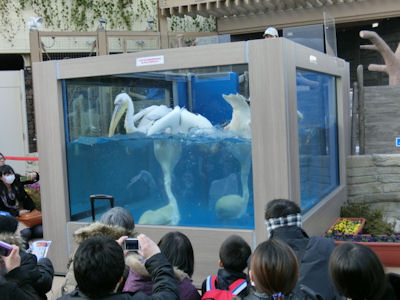 | こちらはペリカンのエサやりショー。ご覧のとおり、胴体は水面に浮かべたまま、首だけ水中に突っこみ、プールの底に落ちた魚を、大きなノド袋でさらい取る。いや、意外性たっぷりでした。 水深がもっと深かったらどうやってエサをとるんですか?という疑問を残さずにはおかない、罪作りなショーでもある。 |