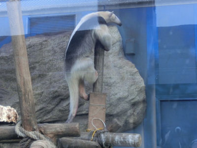 | 改装前には再三、オリから脱走を図って勇名(?)をはせたミナミコアリクイ。・・・と言いたいところだが、3頭ぐらいいるはずだから、この個体が脱走アリクイなのかは不明。 とはいえこいつも活発で、こうやって木登りしたり、天井の金網にぶら下がったり、背後の岩に潜りこんでみたり。『大脱走』のスティーブ・マックイーンよろしく、「どうぶつたちの水辺」という新たな捕虜収容所の警備の穴を、虎視眈々と探っているのであろう。 |