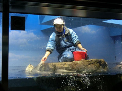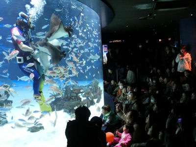 ここまでは屋外ゾーンの「マリンガーデン」だったが、ここからは屋内のゾーンへ。 この大水槽はリニューアルのもう1つの目玉「サンシャインラグーン」だ。水量は改装前の2倍の240トンを誇る。ビルよ、潰れんか? ショーが始まる前には、「うわー、大きなサメやエイがいっぱい泳いでいるなあ」と感心していたのだが、ダイバーが登場してビックリ。意外に小さいじゃん。というか、ダイバーが異様にデカいじゃん。水槽の形状が凸面なので、中の生物が実際よりもずっと大きく見えるんですね。 エサやりするダイバーと、水槽外にいるガイドが、掛け合いでパフォーマンスを見せるのがユニーク。 |