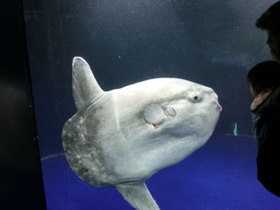 | 実際の生息環境に合わせているのか、マンボウの水槽は多くの水族館で照明が暗めになっている気がする。このヘンテコなデカい魚が、薄暗い水中をユラリユラリと泳いでいる光景も、それはそれで悪くはないのだが、困るのは写真が撮りにくいこと。 サンシャイン水族館の「マンボウとの出会い」も、ご多分に漏れず照明は暗めだったが、この時はたまたまガラスの近くを泳いでくれたので、割にはっきりした写真が撮れた。 |