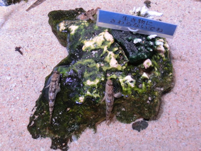 陸に上がって甲羅干し(?)しているトビハゼ。 「さわらないでね」と言われると、余計にさわりたくなる人、けっこういるんじゃないかしらん? |