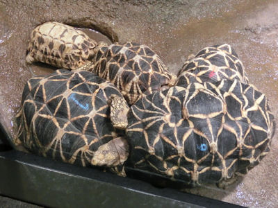 ホシガメの甲羅には、なぜか「背番号」が書きこまれていた。青い数字がオスで、赤い数字がメスなのか? 手前左側はゴールキーパーなのか? |