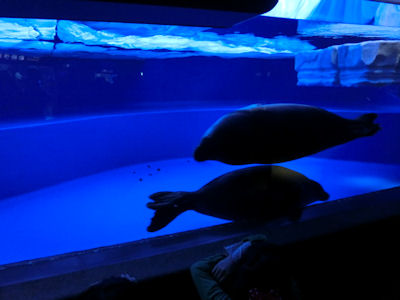 | 狭めの水槽を休むことなく泳ぎ回っていたバイカルアザラシ。照明が暗いことも相まって、写真を撮るのに苦労した。 2頭は常に交差するように泳いでいて、同じ方向に並んで泳ぐということはないみたい。 |