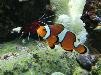 ご存知、カクレクマノミと、色鮮やかなシロボシアカエビのツーショット。このエビ、茹でたら何色になるんでしょ? |