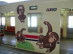 | 京王線の高幡不動駅から多摩動物公園駅へと向かう一駅だけの電車。車内の吊り広告も動物園づくしなら、車両の外もこんな具合。 よく見るとペイントではなくシールなんですね。いかがですか、東京のお土産にペラリとはがして・・・って、よい子はしてはいけません。 |