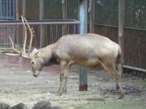 | 多摩動物園の目玉商品の1つ、シフゾウ。子供の頃から雑誌などで名前はよく見ていたのだが、各地の動物園を回るようになった今も、実物は多摩動物園以外では見たことがない。野生種はすでに絶滅した珍品だ。 シフゾウとは「四不像」。角は鹿、頭は馬、体はロバ、ひづめは牛に似ているということで、この名がついたとか。確かに顔は馬面です。 |