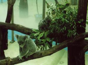 | 多摩のコアラたちも、ご多分に漏れず立派な獣舎があてがわれている。広々としているが、屋根付きなのでお日様は当たらない。 オーストラリアに行ったとき、コアラには2種類いると教わった。南方系(南半球の豪州では寒い地方)は体毛がグレーで大型、北方系は茶色で小型。どうやら多摩のコアラたちは前者であるようだ。 |