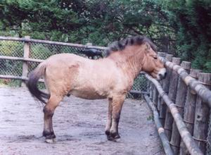 | モウコノウマも、シフゾウと同じく、野生種がすでに絶滅した動物だ。「蒙古の馬」ではなく、「蒙古野馬」なので、念のため。 体型がサラブレッドと全然違いますね。日本でも、木曾義仲が乗っていた頃の馬は、たぶんこんな体型だったのだろうと思う。 背中にカラスなど乗せて、寄生虫でもついばんでもらっているのだろうか。 |