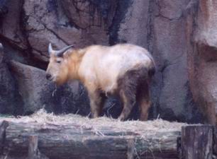 | ゴールデンターキンは、中国の山岳地帯にすんでいる。その名の通り、光り輝く体毛が特徴・・・なのだが、後ろ足は泥だらけだ。折しも台風が関東地方を直撃した2日後。運動場もぬかるんでいたのだろう。 角の生え方が、どことなく悪魔的ですね。 |