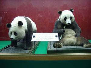 | 正面入り口横の「ウォッチングセンター」で剥製となっているパンダたち。右側の奴など、そのペタンと座った姿勢といい、お腹の汚れ具合といい、とってもリアルである。 今年(2004年)はパンダの剥製をネットオークションに出して有罪判決を受けた奴が現れたが、いったいどこから手に入れたのか? |