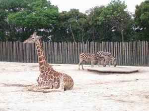 | キリン、シマウマ、ダチョウが同居する「アフリカサバンナ」(ダチョウはうまくフレームに入ってくれませんでした)。 野生のキリンは、捕食者に襲われてもすぐ逃げられるよう、ずうーっと立ちっぱなしでいると何かで読んだことがある。そう言われてみれば、動物園にいるキリンもたいていは立っていますよね。こうしてしゃがみ込んでいる姿を見るのは珍しいかも。 |
