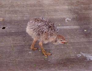 | こちらはダチョウ。・・・といっても今年生まれたばかりのヒナなので、大きさはキウイぐらいである。ちょこまかして、なかなかかわいい。 「キリンの子供」と表示されたままの小屋に展示してあるのが、この動物園のユルさを象徴していて好ましい。 |