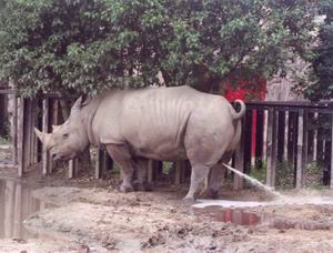 | 盛大にオシッコを飛ばしているシロサイ。 サイとカバって、見るたびにその大きさに驚く。あちこちの動物園で何度も見ているのに毎度、「サイ(カバ)ってこんなに大きかったっけ?」と思っちゃうんだよね。どうも日常生活を送る間に、脳内のイメージがクマかウシぐらいの大きさに修正されてしまうようだ。 逆にゾウは「大きい動物」という固定観念があるから、場合によっては「意外に小さいじゃん」と感じちゃったりする。けだし人間の下す評価って、「そのものの絶対値」ではなく、「期待値に対する絶対値」で決まるのである。 |