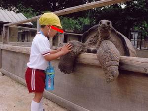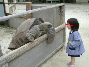 | 「ふれあい動物村」にいるアルダブラゾウガメ。 サラリーマンのお父さんが日曜大工で作ったようなケージがいい味を出している。「旭山は旭山で勝手にやってくんねい」って気概を感じますね。 「ふれあい動物村」というくらいだからお触りOKなのだろうが、ガキンチョたちの対応は、怖がって近寄らない者から、平気でなで回す者までまちまち。これが個性というものだ。 肖像権保護のために目消しを入れたが、この少女とは目と目を合わせて見つめ合っているところが面白い。愛は言葉を超える? |
