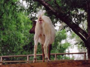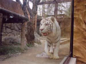 | ネコ科の動物が集まる中、このホワイトタイガーだけが強化ガラス張りの新型動物舎に入れられ、他のビッグキャットたちの羨望を浴びていた。 1つおいた隣では、ピューマがサカリのついたネコみたいにギャーギャー鳴いている。そう、アメリカライオンなんて異称を持ちながら、ピューマはライオンやトラのような咆哮を上げない(形態的に上げられない)のだ。 |