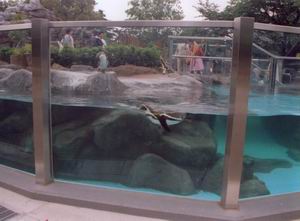 | パンパカパーン!これが創立25周年の目玉。2006年3月18日に完成したばかりの新ペンギン舎だ。プールを自在に泳ぎ回るペンギンを強化ガラス越しに観察できるほか、ペンギンたちを左右に見ながら来園者が中央の通路を歩いていける構造にもなっている。 クラシックな展示形態を取る動物舎が多いこの動物園にあって、ここだけは異色。 |