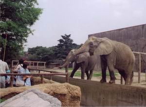 | アフリカ象が好き!な人は「ゾウさんのランチタイム」がお薦め。先着25組に限り、こうやって棒の先に付けたエサを、ゾウさんに食べさせてやることができる。ひと組につきエサは4つで、料金は500円だ。 濠を挟んではいるのだが、やはりあの位置に立って見上げると、かなりの威圧感だろうと思う。怖がってろくに棒を差し出せない子供もいた。 |