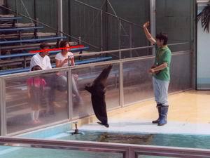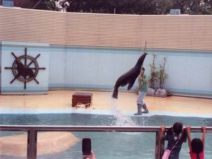 | ペンギン舎の裏ではアシカのショーも見せてくれる。 とはいえ、この新米のムーちゃん、途中でトレーナーの言うことを聞かなくなり、あえなくベテランのケープちゃんと交替させられた。 |