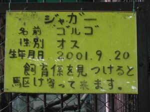 | この動物園では種名だけではなく、個々の動物の名前も一緒に表示されている。親しみが沸いて、私は好きだ。 これは飼育係氏の手書きですね。「駆け寄って」きたゴルゴ君のディナーにされないよう、お気をつけください。 |