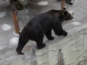 | エゾヒグマ。「動物園のクマさん」よろしく、右へ左へと落ち着きなく歩き回る。ながめていたら不思議なことに気がついた。写真のように左から右に歩くときには、必ず濠の縁の一段高くなった線上を歩くのだが、右から左に戻ってくるときは、決まってその少し内側を歩く。やはり心臓の分だけ体の左半分の方が重いから、体の左側を崖っぷちにさらすのは怖いということなのか? | |