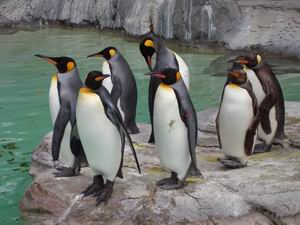 | オオサマペンギン。白黒のツートーン・カラーに頭部の黄色がアクセントとなって、なかなかノーブルな美しさがある。 右から2人目(と思わず言いたくなりますね)のペンギンにご注目いただきたい。爪先を持ち上げ、かかとだけを付けた姿勢で、微動だにせず延々立ちつくしていた。 |