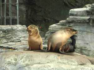 | 2002年5月に生まれたばかりのカリフォルニアアシカの子供たち。かゆいよう、ポリポリ。 どこの動物園に行ってもそうだが、アシカの仲間というのは胸のすくような速さでプールをグングン泳ぎ回っている。時折美しいジャンプなど披露し、サービス精神満点である。他の多くの動物がベタッと無気力に寝ころんでいるか、狭いオリの中を神経症的に歩き回っているかのどちらかである中で、この快活さには得難い魅力がある。税金で食べさせてもらっている者の鑑だね。 |
