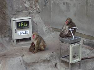 | 猿山って飽きないよね。特に食事の時間などは、そこここで小さなドラマが展開され、ながめていると15分や20分すぐにたってしまう。 写真はサルの体重計。右側のサルが乗っている金属の台状の部分がはかりになっている。こうした来園者サービスは楽しい。 |