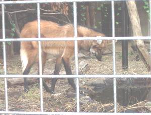 | タテガミオオカミ。その名に反してオオカミの仲間ではないそうだ。 おいしそうな赤身のスライス肉を拾って食べていたので、たまたま檻の外から観察しておられた飼育係の方に聞いてみると、馬肉だということだった。「それに“ケートー”もいくつかまいてあります。鶏の頭ですね」ひょえー、気持ち悪いよー! はっきり見えなくてよかったよー! ほんとのオオカミと違って雑食で、野菜や果物も食べるとか。「サツマイモも与えてますよ。生じゃ食べないけど、煮てやると食べるんです」 この軟弱オオカミがぁ! |