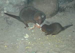 | コビトマングース。ゆで卵を与えられていたが、見ていると黄身だけ食べていたような。 「本当はあっしらだって、わざわざリスクを冒してハブなんぞ食いたくないんでさあ。ただね、ダンナがたが時々フグを食いたくなるように、あっしらも、あの舌でピリつく感じがたまに懐かしくなるんでげすよ」とのことであった。 ちなみに「コビト」は今や放送禁止用語で、まともなワープロでは漢字変換もされなくなっているが、動物の種名にはけっこう残っている。 |