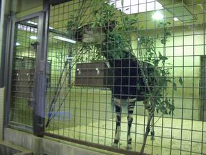 | オカピ。 ジャイアントパンダ、ボンゴと並ぶ世界三大珍獣の1つ。コビトカバを加えて四大珍獣とする説もある。というか、これについてはいろいろな人が好き勝手な数え方をしています(苦笑)。 体の各部が様々な動物に似ているが、キリンの仲間。20世紀になるまで人間に見つかっていなかったってんだからすごい。 |