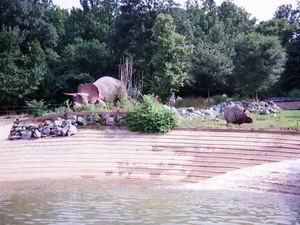 | ま、言うまでもないが、右のサイは本物で、左のトリケラトプスは作り物。偶然ながら、シンメトリーの面白い構図になった。 来場者との間には大きな池が配置してあるので、一見どちらも生きているように見える。友達に写真を見せると、例外なく大ウケだった。 遊び心あふれる、楽しい展示法である。 |